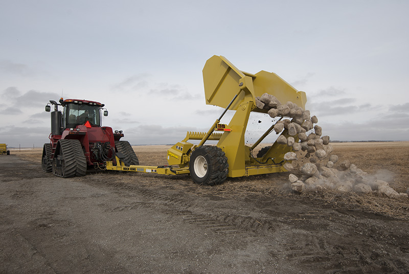 All Degelman rock pickers have open floors that allow dirt to fall through and back into the field as it breaks off the rocks, preventing the removal of soil from the field. They also come with hydraulic dumps and replicable